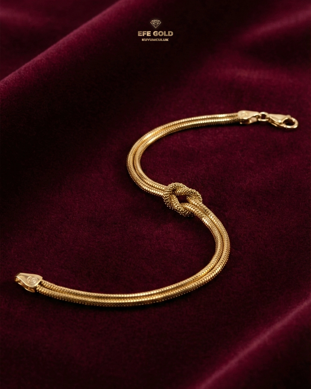 Her bir halkası ve düğüm detayı usta ellerde titizlikle şekillendirilmiştir. Yüksek altın kalitesi ve esnek yapısıyla bileğinizde konforlu bir kullanım sunar. Mamak atölyelerimizde modern kuyumculuk teknikleriyle özel olarak üretildi. Bu özel bileklik Efe Gold güvencesi altındadır. İşçilikteki hassasiyet kaliteye verdiğimiz önemin bir göstergesidir.